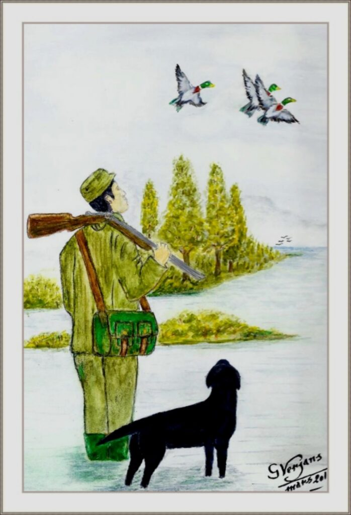 Ici, comme si je voulais terminer en « beauté », j’ai peint un chasseur qui, plutôt que d’épauler, laisse son fusil « cassé » sur l’épaule, et admire avec son labrador, le vol de trois canards colvert passant à proximité.