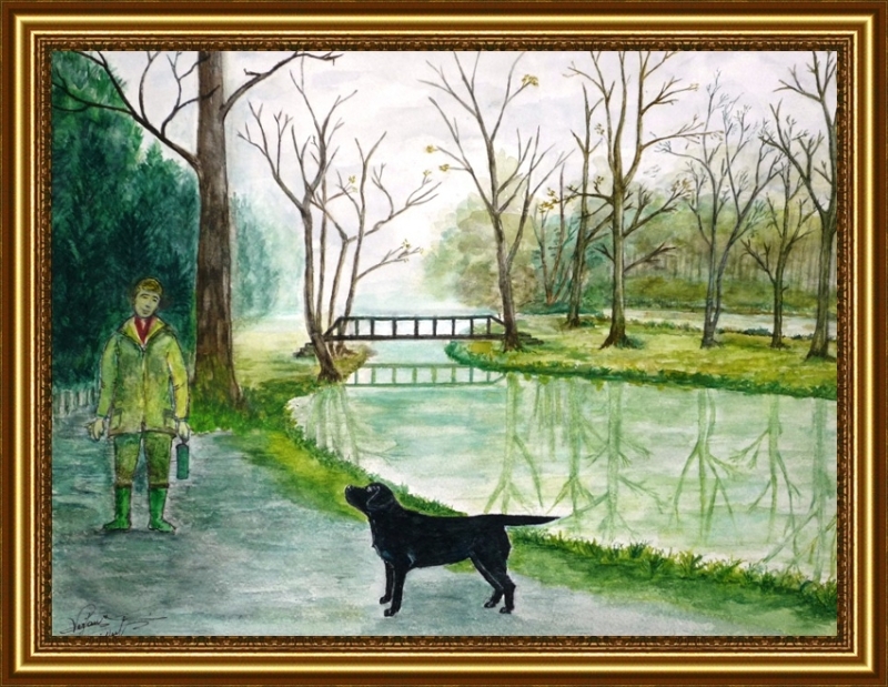 Sur cette aquarelle, j’ai voulu représenter, au travail au Castel saint Pierre de Beauraing, une des meilleures chiennes que j’ai éduquée, à savoir ma championne Joy. Je me suis inspiré d’une aquarelle d’Ignace qui y avait peint un de ses goldens. Réflexion d’Ignace en voyant mon « œuvre » : « Tes reflets sont mal rendus ! » Il avait cent fois raison.
