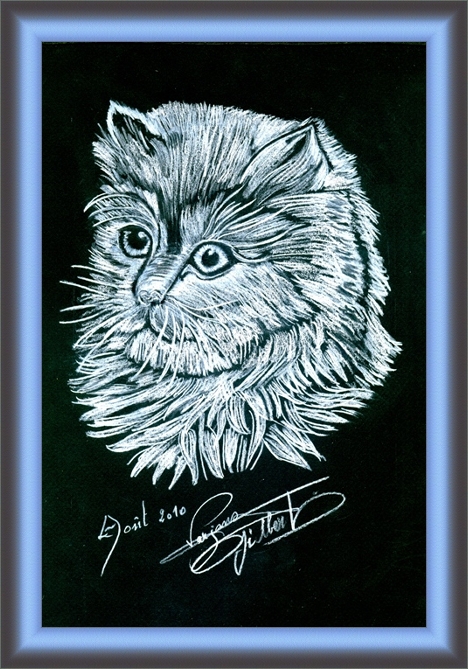 D’abord un chat, un essai au crayon blanc sur fond noir.